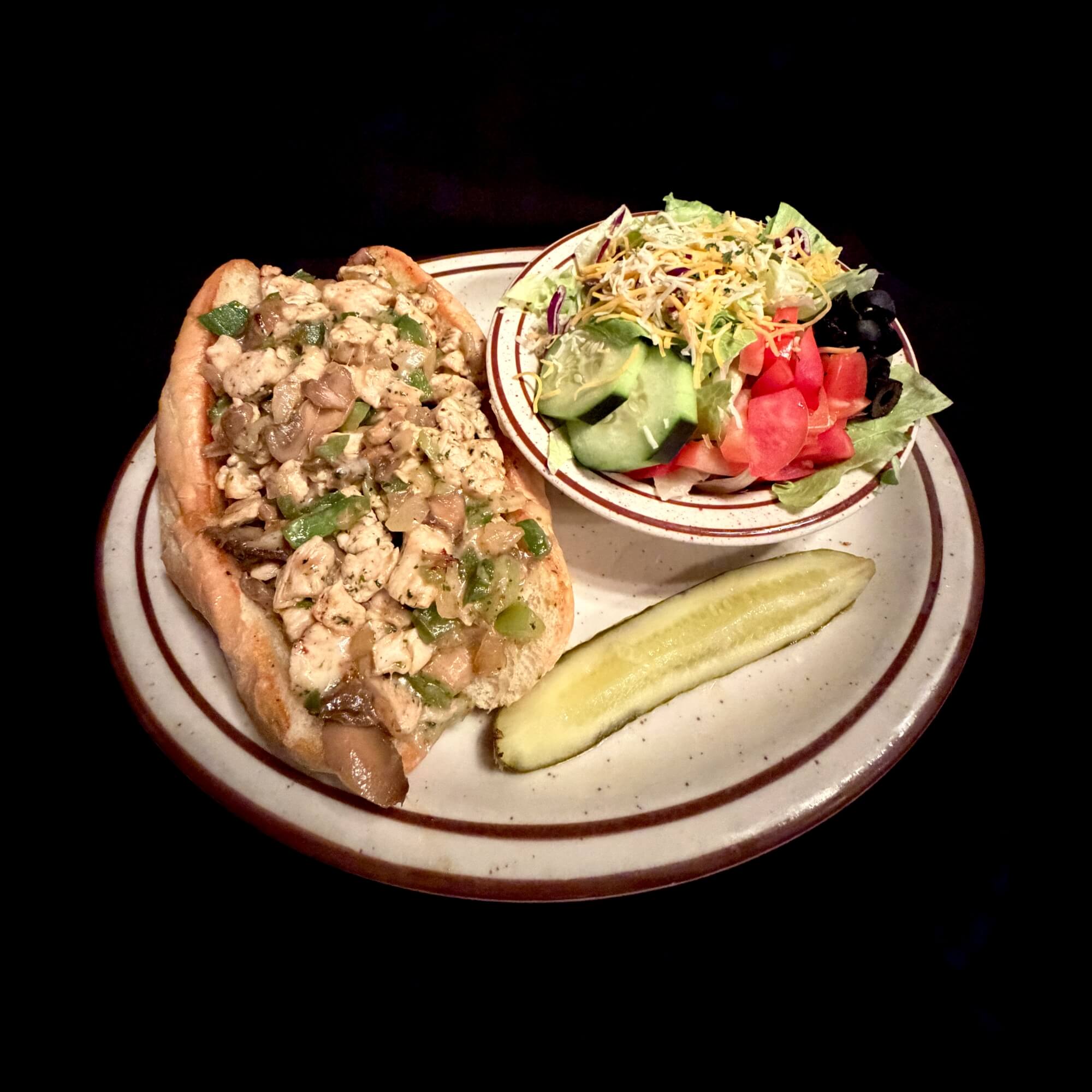 Sliced chicken sautéed with onions, mushrooms & peppers smothered with cheese on a French roll.