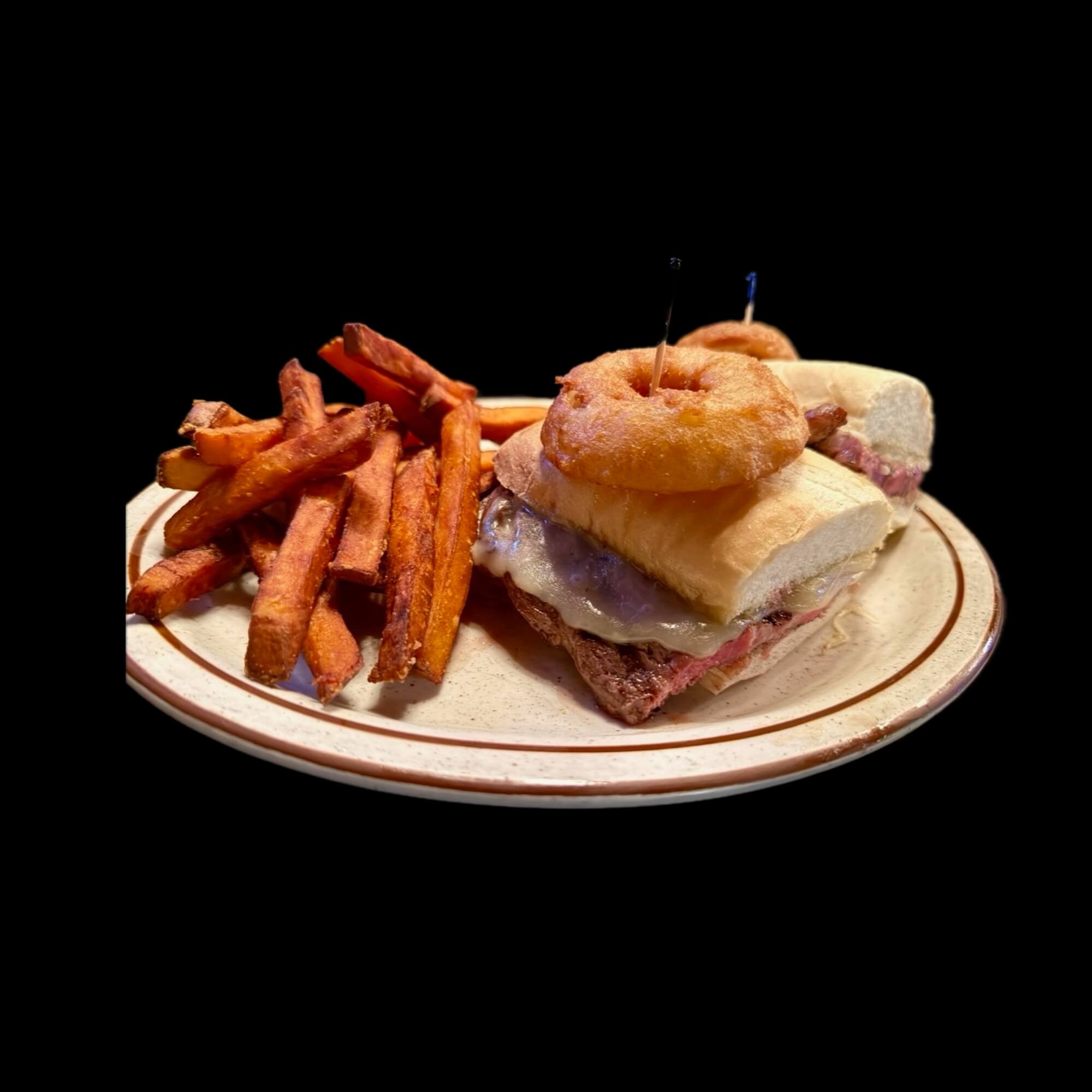 ½ pound patty topped with grilled onions, American & Swiss cheeses, served on grilled rye bread.